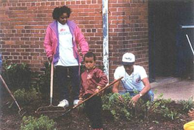 A very young Samson Smoot helping Ms. Debrow and a volunteer with the Turkey Thicket garden.